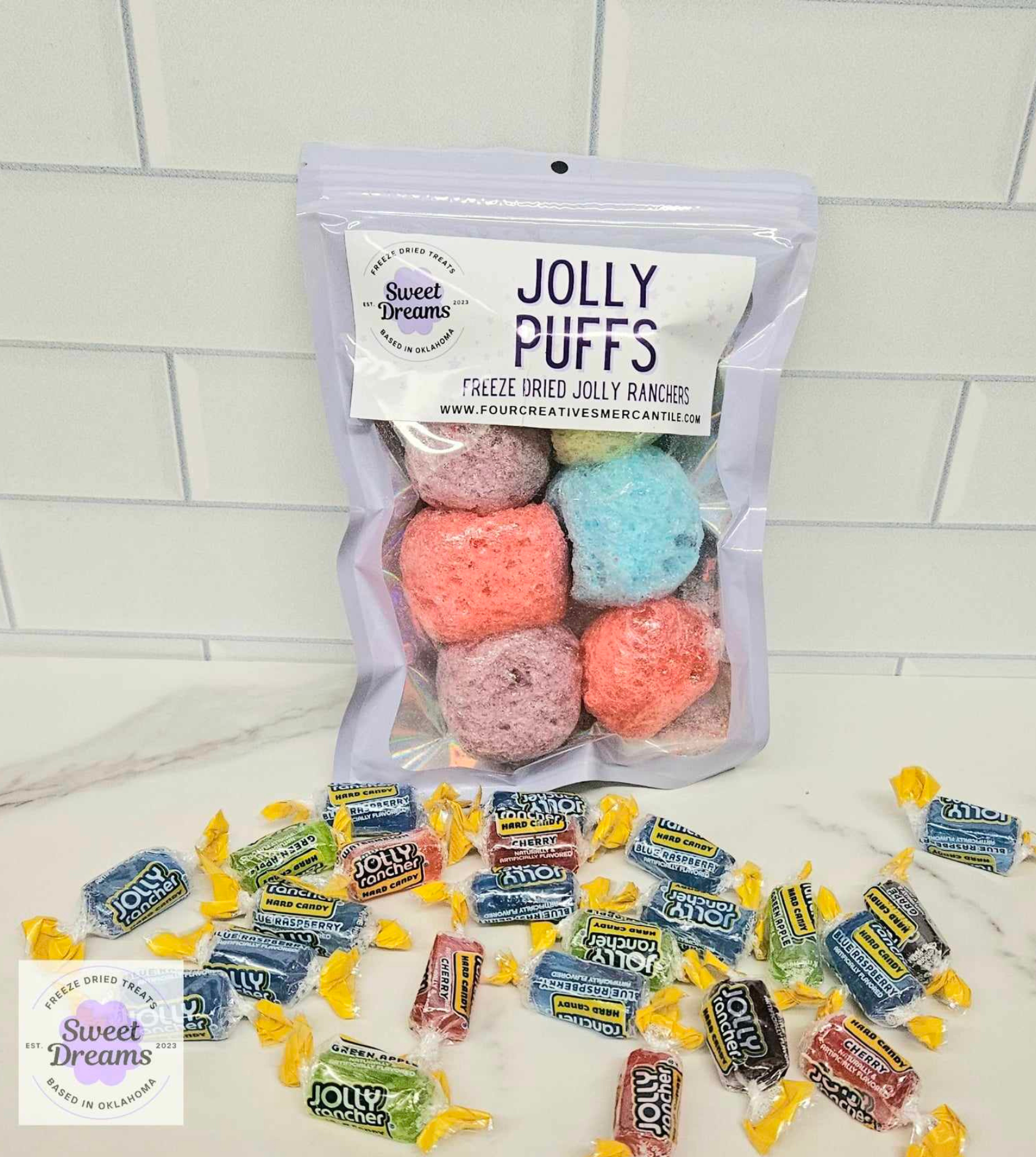Experience the magic of Jolly Puffs, made with iconic Rancher(s) to maximize all the yummy flavors you crave. These crunchy bites pack a "jolly" punch and will leave you wanting more (luckily, there's plenty to share). No more rock-hard candy and endless sucking - enjoy a burst of intense flavor, a light airy texture with the most satisfying crunch!